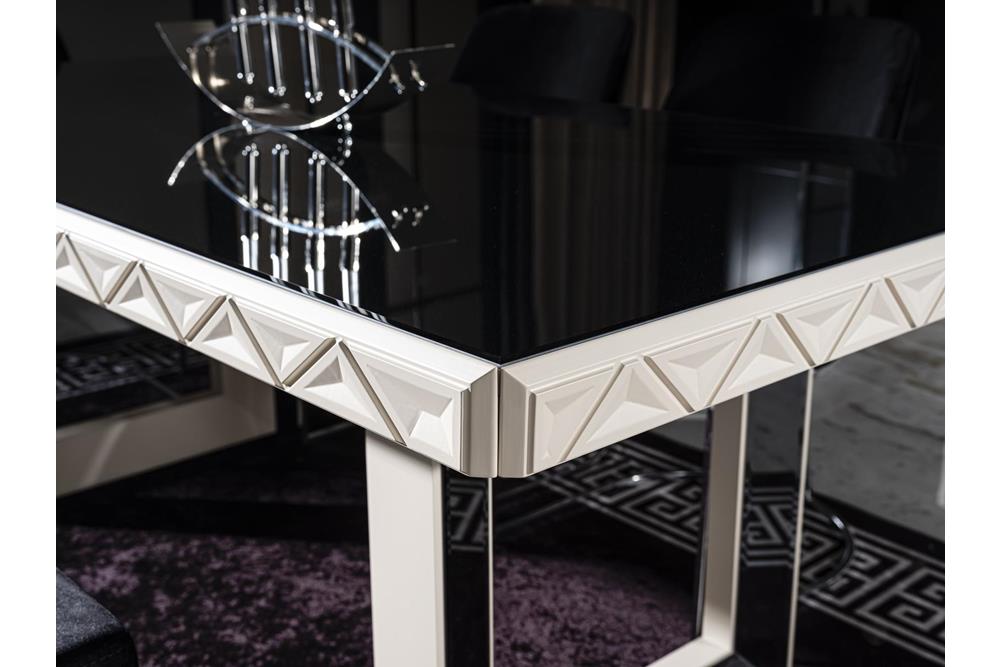 | Yemek Masası | Üst tabla mdf malzeme üzerine ayna konularak üretilmiştir. Ayaklar metal malzeme üzeri krom kaplamadır. Ayak kenarları MDF malzeme üzeri lake boyalıdır. Cnc işçiliği ve ayna ile dekore edilmiştir. |